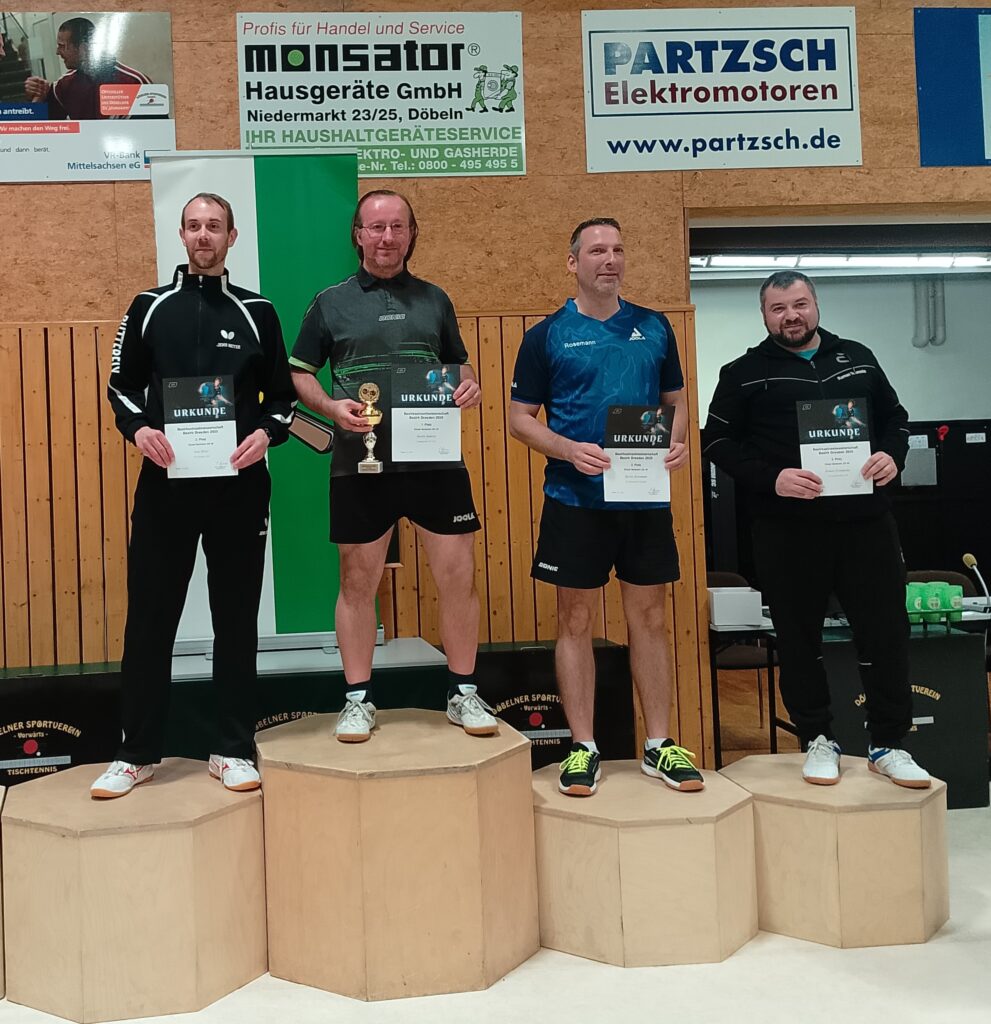 Auch bei seiner dritten Teilnahme an den BEM der Senioren konnte Martin Rakette – wie schon 2023 und 2024 – beide Titel erringen! Im Doppel schafften M.Rakette/König-Stiller nach Erfolgen über Yeromenko/Lyubarskiy (SV Dresden-Mitte 1950/SV Bannewitz – 5, 3, 9) im Halbfinale und Hetze/Geppert (TTV Dresden 2007/TSV Rotation Dresden – 11:5, 11:3, 7:11 und 12:10 nach 2:8) im Endspiel die Titelverteidigung. Im Einzel der Senioren 40 gewann der Sieger der letzten beiden Jahre all seine sieben Partien! In der Vorrunde musste die Nr. 1 des LSV nur zwei Satzverluste gegen Martin Geppert und Daniel Tillig (TTC 49 Freital) hinnehmen. Gegen Martin Vogt (SG Miltitz – 5, 8, 4), Michael König-Stiller (6, 4, 6) sowie den am Ende Gruppenzweiten Martin Rosemann (SV Sachsenwerk Dresden – 4, 3, 6) gab es dagegen sichere 3:0-Siege. In einer Neuauflage des Vorjahresfinals besiegte M.Rakette im Halbfinale Roman Yeromenko, wie im Vorjahr glatt in drei Sätzen (5, 7, 8). Im Endspiel gegen Jens Hetze glückte nach Abwehr eines Satzballs im zweiten Durchgang bei 10:11 ebenfalls ein 3:0-Erfolg (11:6, 13:11 und 11:8). Damit geht Martin Rakette bei den Landeseinzelmeisterschaften der Senioren am 31.01./01.02.2026 in Burgstädt erneut als Bezirksmeister des Spielbezirks Dresden an den Start. Herzlichen Glückwunsch!